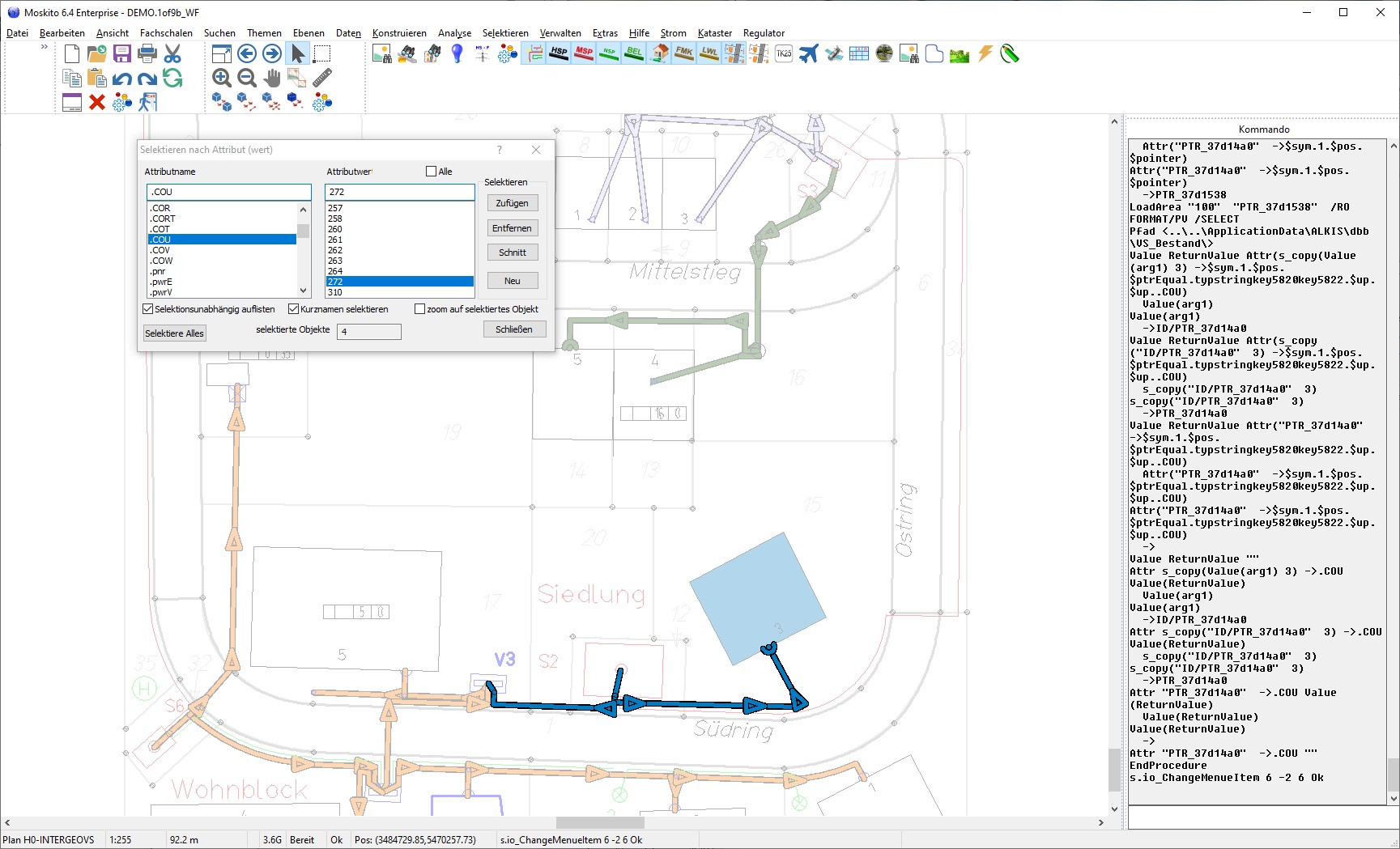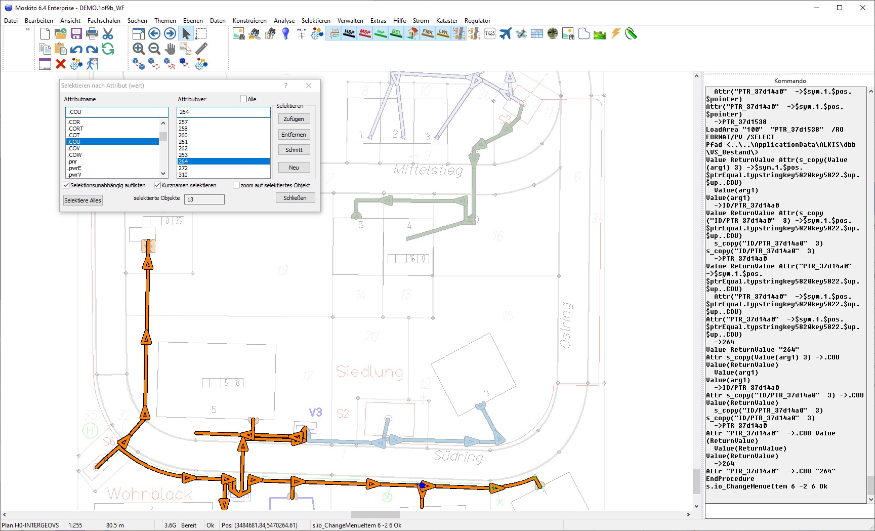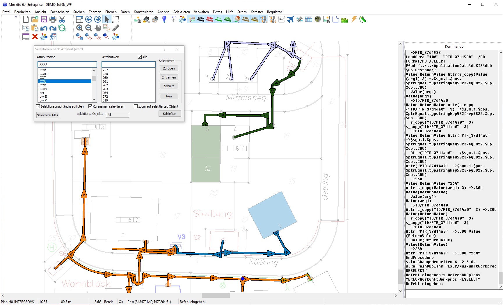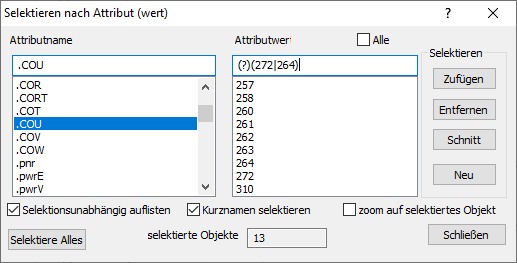 Dort wählt man einen Attributnamen und einen Wert aus, alles noch ohne reguläre Ausdrücke. Ich habe jetzt in der Anwendung Strom auf Stromkreisfarbe als Thema geschaltet, dann sieht man besser, was passiert. Jetzt das Attribut .COU auswählen und über „Alle“ die Objekte (Kabel) mit diesem Wert selektieren.
